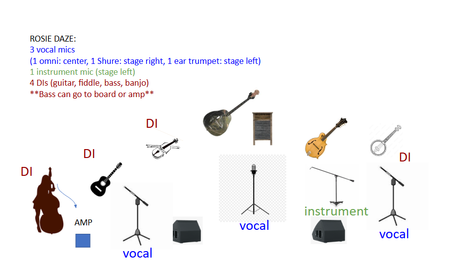 Rosie Daze Band travels with a full audio set up when needed. If PA is present at site, we will bring Ear Trumpet microphones to use.